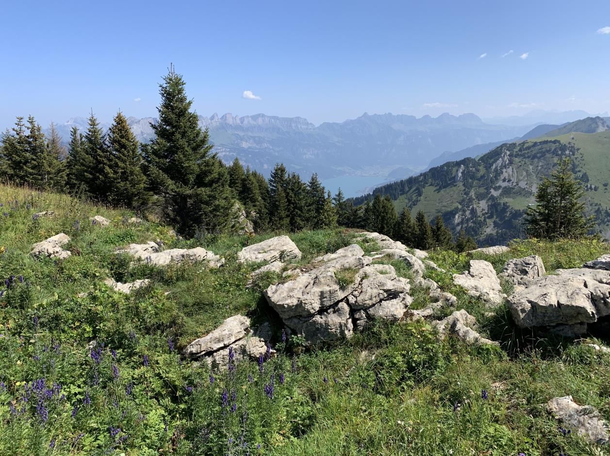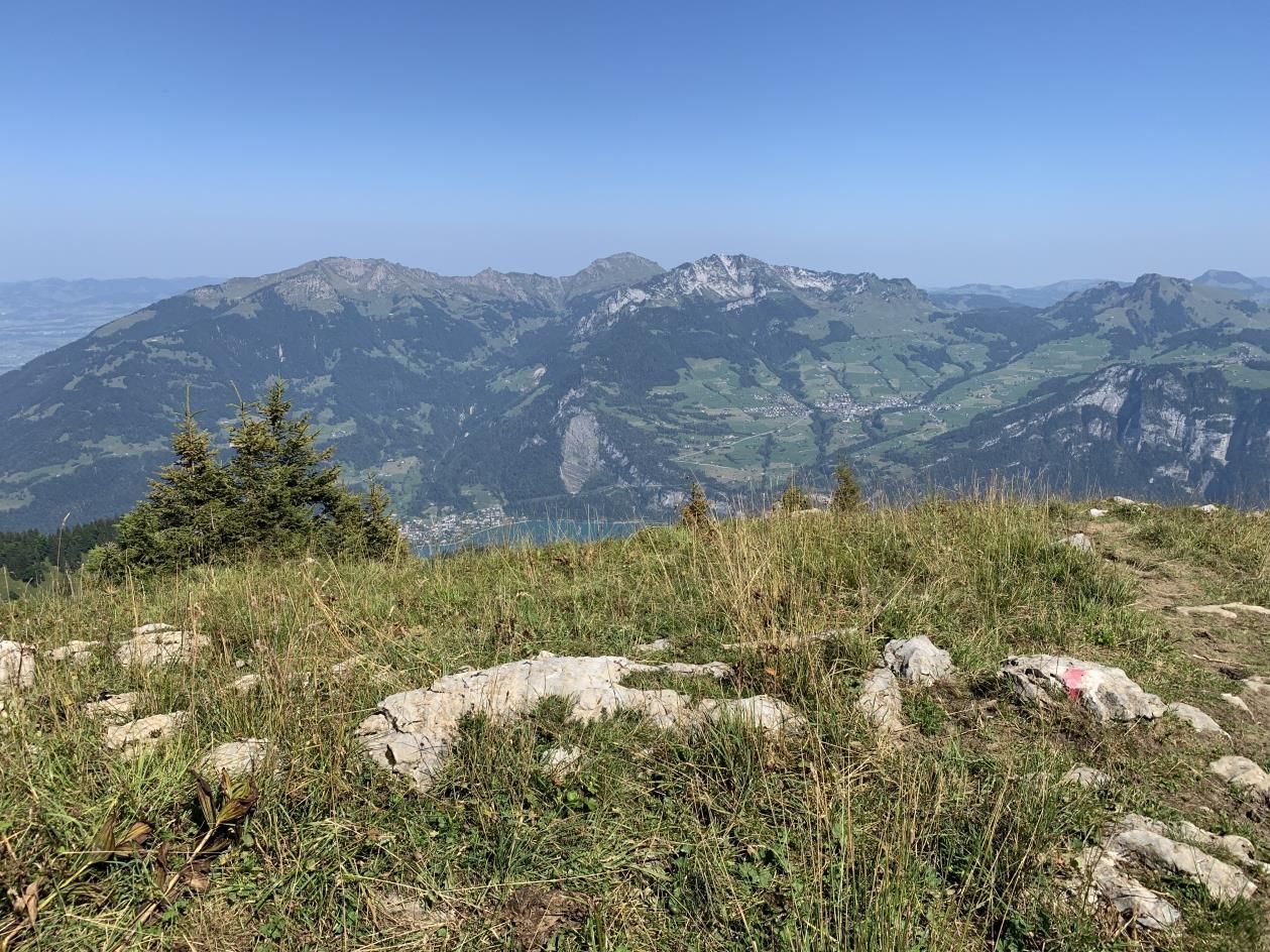 Die Streusiedlung Filzbach ist das westlichste Dorf auf dem Kerenzerberg und liegt auf einer Terrasse etwa 300 Meter über dem Walensee. Heute verfügt das kleine Dorf mit seinen 530 Einwohnern über ein Sportzentrum, ein Seminar- und Erlebnishotel sowie ein Kurs- und Ferienzentrum. Der Ausgangspunkt dieser Rundwanderung befand sich bei der Bergstation der Sesselbahn Filzbach-Habergschwänd. Im Bergrestaurant gab es einen Startkaffee. Dann führte der Weg Richtung Nüenalp und bog dann in wenigen Minuten nahe Habergschwänd-Winkel scharf links ab. Der weissrot-weiss markierte Bergwanderweg zog denn auch gleich ordentlich in die Höhe. Es lohnte sich immer wieder stehen zu bleiben und die wunderschöne Aussicht hinunter nach Filzbach und den Walensee sowie hinüber nach Amden und Weesen zu geniessen. Die Route schlängelte sich durch Blumenwiesen stetig aufwärts, bevor man beim Chamm-Hüttli ausruhen konnte. Der runde Rücken des Nüenchamm war von hier aus gut zu sehen und nicht mehr weit. Nun ging es noch ein Stück bis zum Wegweiser bei Oberchamm, wo man in wenigen Minuten den höchsten Punkt mit dem Gipfelkreuz erreichte. Das weite Gipfelplateau des 1906 Meter hohen Nüenchamm war ein idealer Ort für das Picknick, mit einer prächtigen Rundsicht über die Linthebene bis zum Zürichsee, hinüber zum Säntis und in die Glarner Alpen sowie auf den nahen markanten Mürtschenstock. Nun wanderte man auf dem Rundweg via Oberst Nüen und Steinboden zur Mittler Nüenalp, wo man sich in der Besenbeiz erfrischen konnte, bevor es bei der Bergstation Habergschwänd mit der Sesselbahn wieder hinunter nach Filzbach ging.