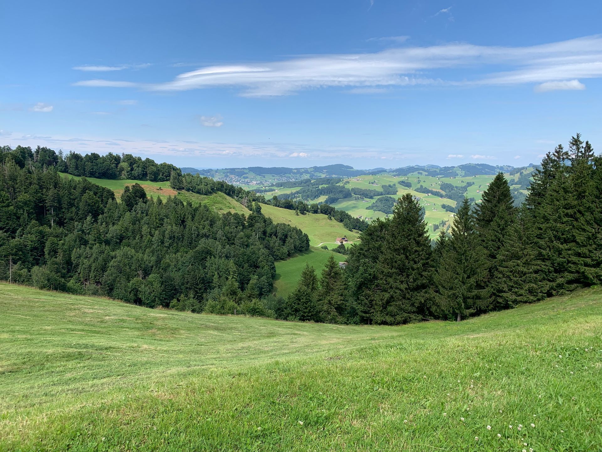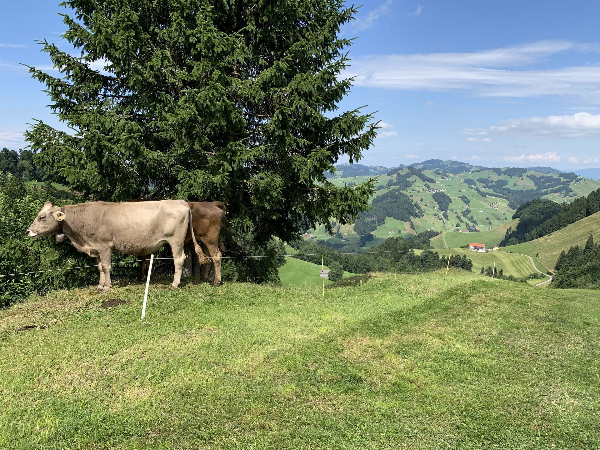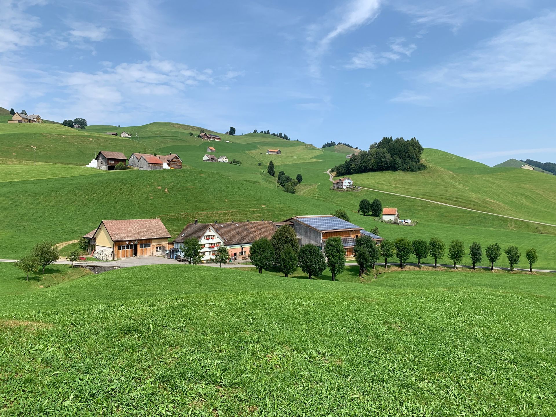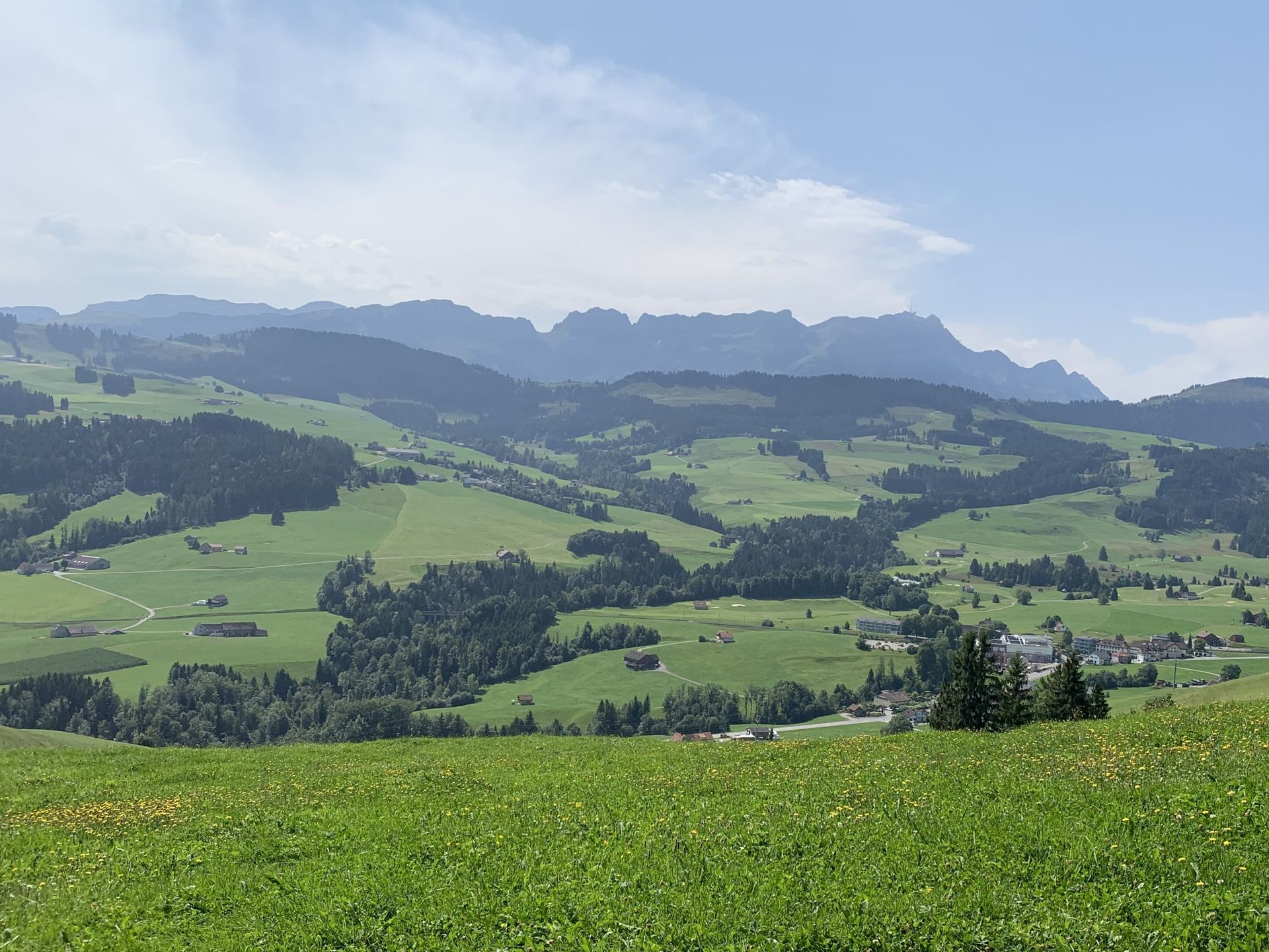 Vom Bahnhof startete man Richtung Landgemeindeplatz und zur Freude der Teilnehmenden konnte man einige Kühe mit wohlklingenden Glocken und Bauern in verzierten Trachten hören und beobachten. Nach dem Startkaffee im Gartenrestaurant bog die Route gegenüber des Gymnasiums St. Antonius rechts auf den Appenzeller Kappellenweg ab. An den Kreuzungen folgte man stets den Wegweisern Richtung Himmelberg und verliess dann bald den Kantonshauptort. Es wurde immer grüner und hügeliger. Beim Weiler Münz stand auf einer Infotafel, dass hier in der alten Mühle zwischen 1737 und 1742 die Innerhoder Münzen geprägt wurden. Kurz darauf ging es vorbei an einer kleinen Kappelle. Dann stieg man im Schattenwald etwa 300 Höhenmeter zum Himmelberg hinauf und weiter zur Chuterenegg, mit prächtigen Ausblicken auf das markante Alpsteinmassiv und über sanfte Hügellandschaften bis hin zum Bodensee.