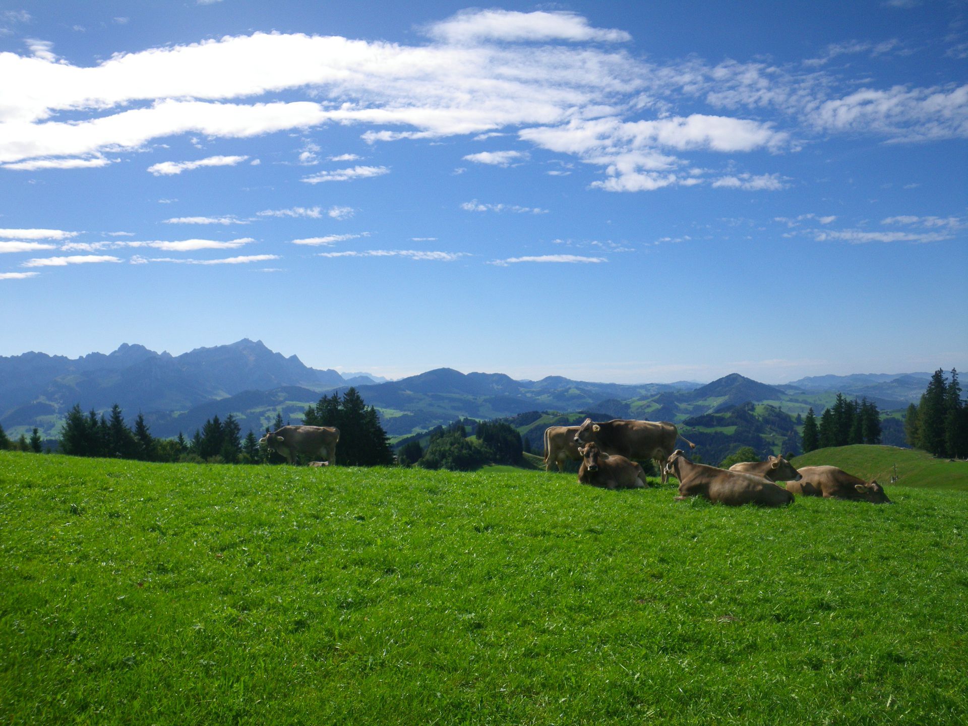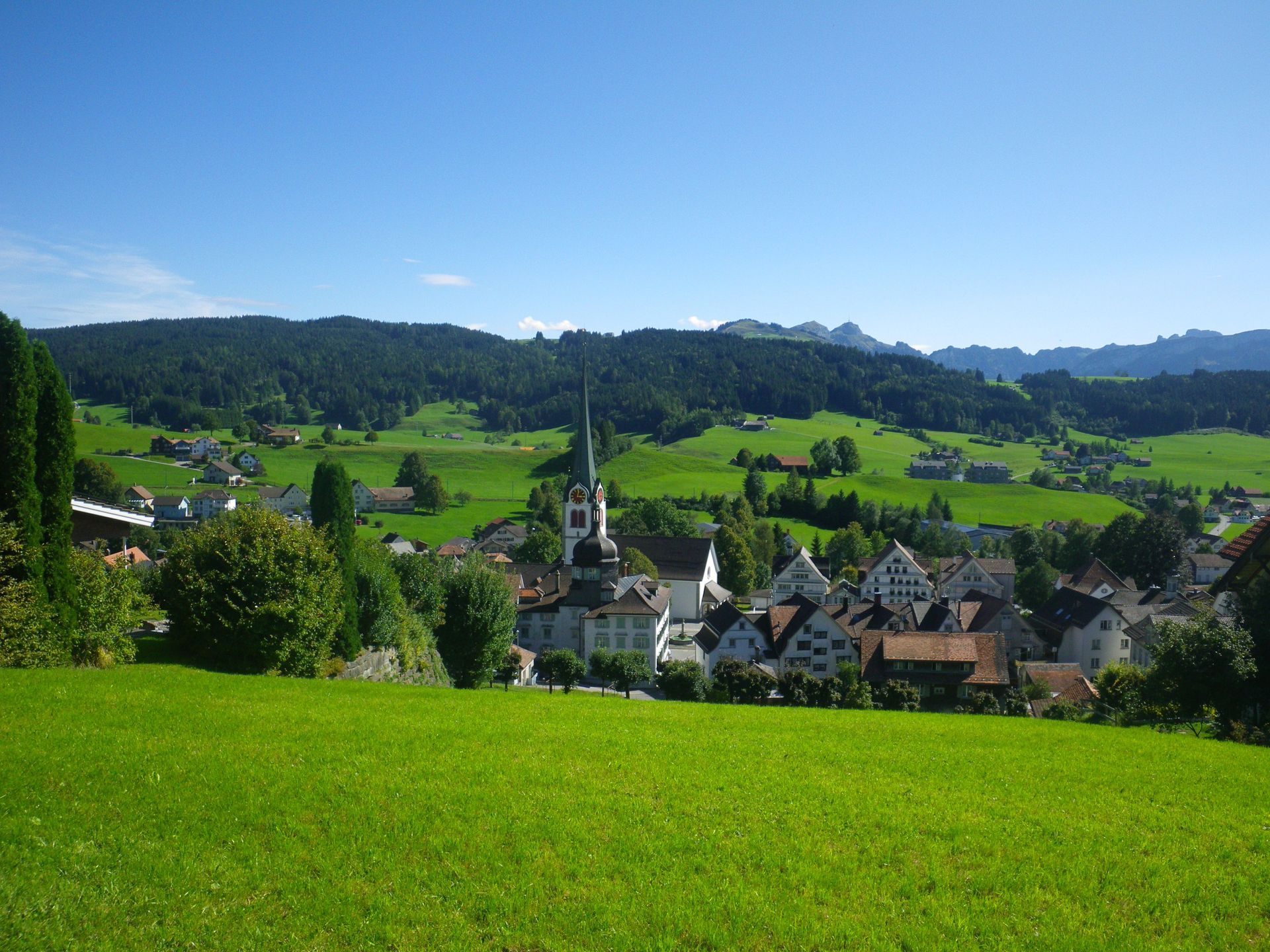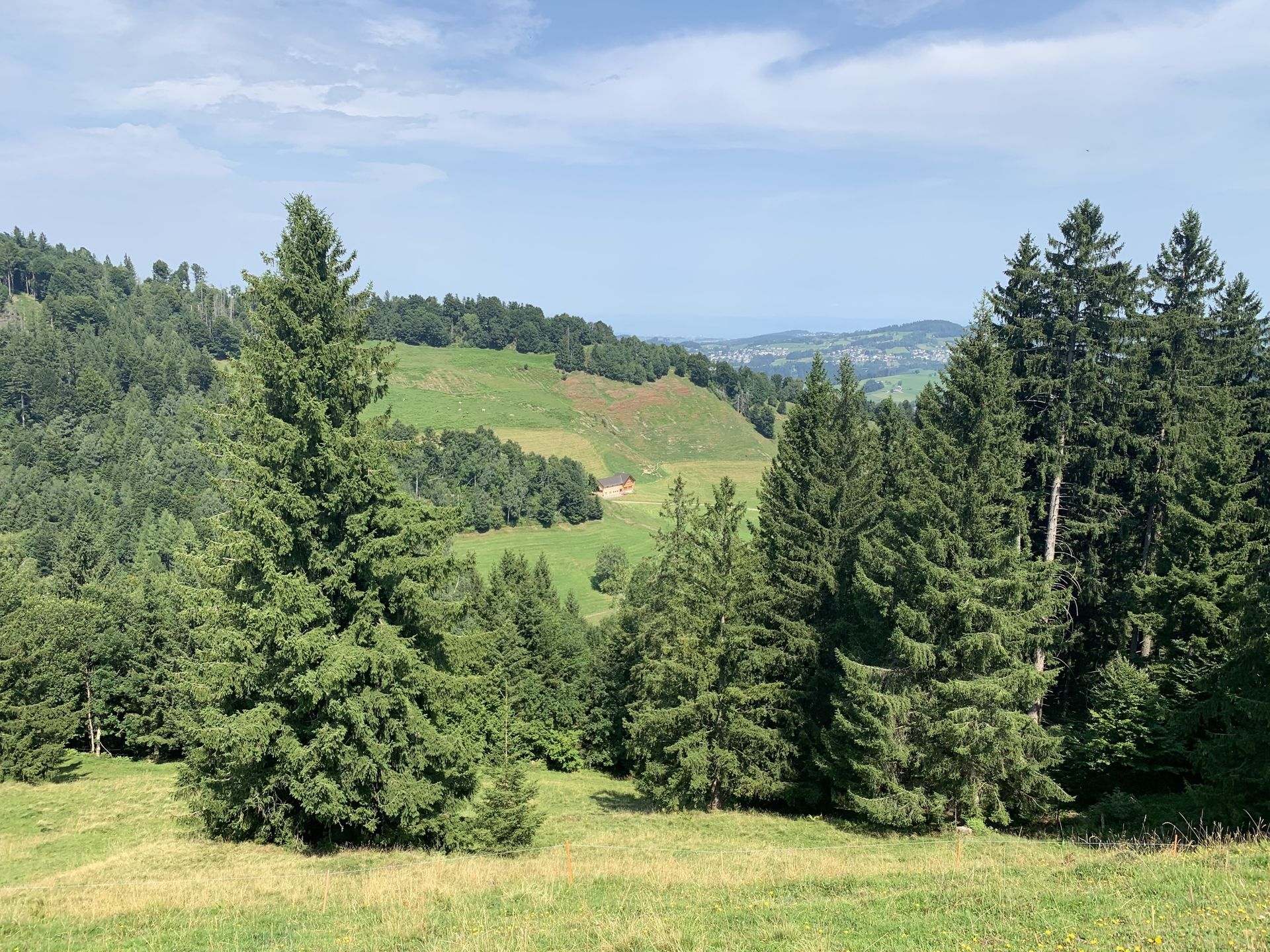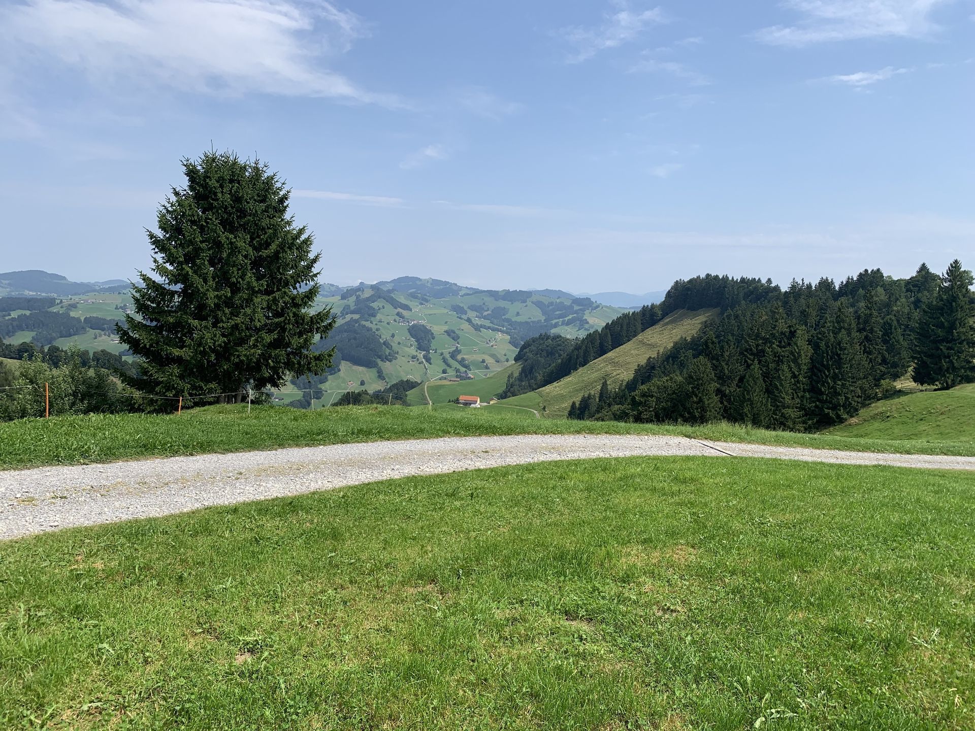 Vom Bahnhof startete man Richtung Landgemeindeplatz und zur Freude der Teilnehmenden konnte man einige Kühe mit wohlklingenden Glocken und Bauern in verzierten Trachten hören und beobachten. Nach dem Startkaffee im Gartenrestaurant bog die Route gegenüber des Gymnasiums St. Antonius rechts auf den Appenzeller Kappellenweg ab. An den Kreuzungen folgte man stets den Wegweisern Richtung Himmelberg und verliess dann bald den Kantonshauptort. Es wurde immer grüner und hügeliger. Beim Weiler Münz stand auf einer Infotafel, dass hier in der alten Mühle zwischen 1737 und 1742 die Innerhoder Münzen geprägt wurden. Kurz darauf ging es vorbei an einer kleinen Kappelle. Dann stieg man im Schattenwald etwa 300 Höhenmeter zum Himmelberg hinauf und weiter zur Chuterenegg, mit prächtigen Ausblicken auf das markante Alpsteinmassiv und über sanfte Hügellandschaften bis hin zum Bodensee.