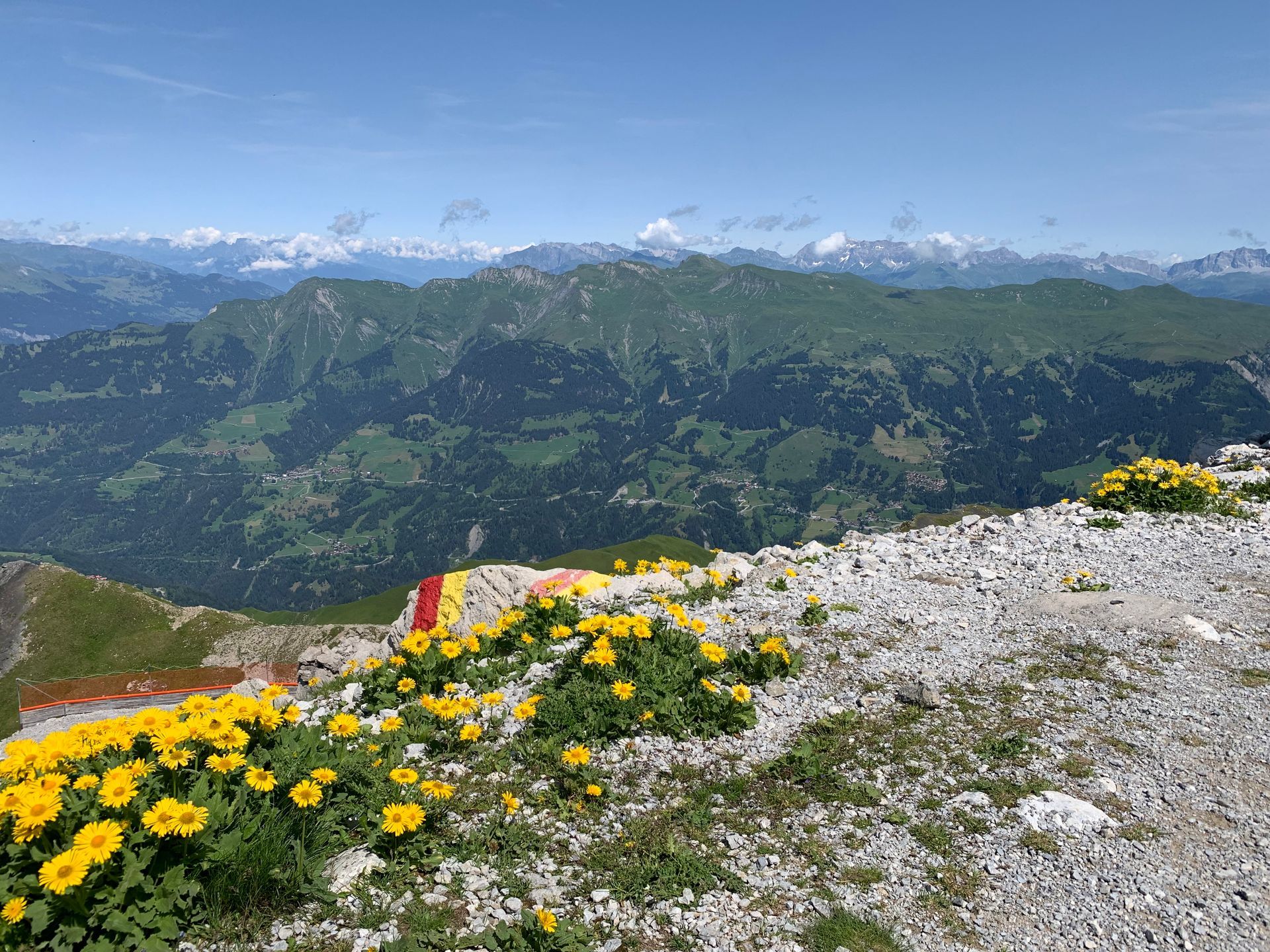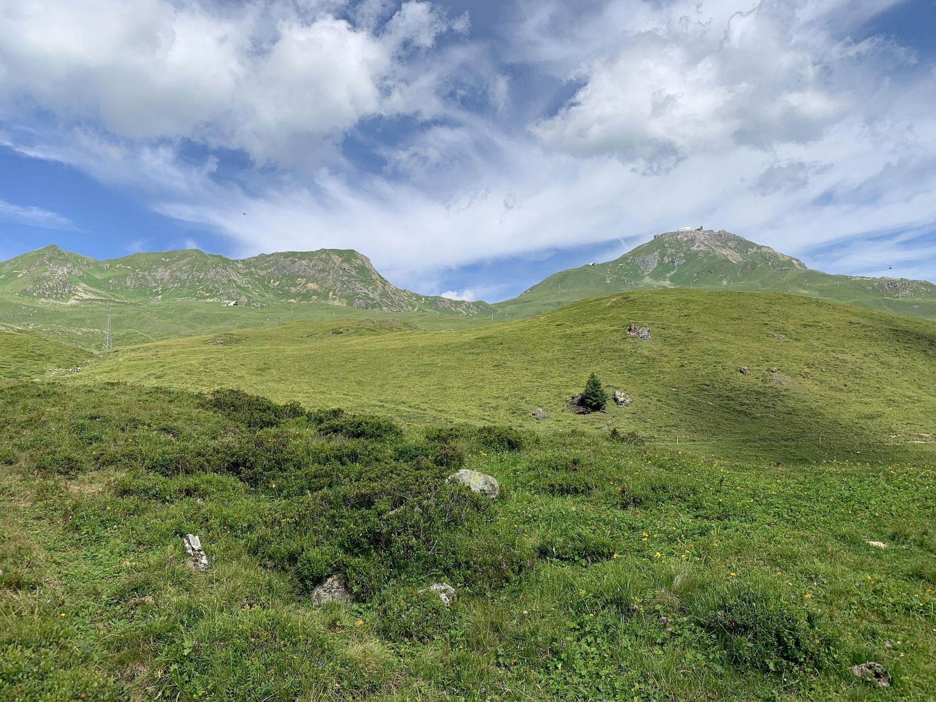 Der Ausgangspunkt dieser Wanderung war die Mittelstation der Luftseilbahn Arosa-Weisshorn. Von hier führte der Pfad durch eine blumenreiche Wiesen- und Mooslandschaft stetig bergauf mit weitreichenden Ausblicken über das gesamte Wander- und Skigebiet sowie ins Tal Schanfigg. Ab der Sattelhütte führte der letzte Stich zum Gipfel meist durch steiniges Gelände. Auf dem 2655 Meter hohen Weisshorn gab es ein atemberaubendes 360° Bergpanorama. Nach dem Picknick aus dem Rucksack kehrte man im Gipfelrestaurant mit der höchsten Kleinbäckerei Europas ein. Mit ähnlichem Charakter gab es einen steilen Abstieg bis zur Carmennahütte. Nun führte der Weg über Wiesen zurück ins Tal nach Innerarosa, wo man sich im Ausflugsrestaurant Alpenblick erfrischen konnte.