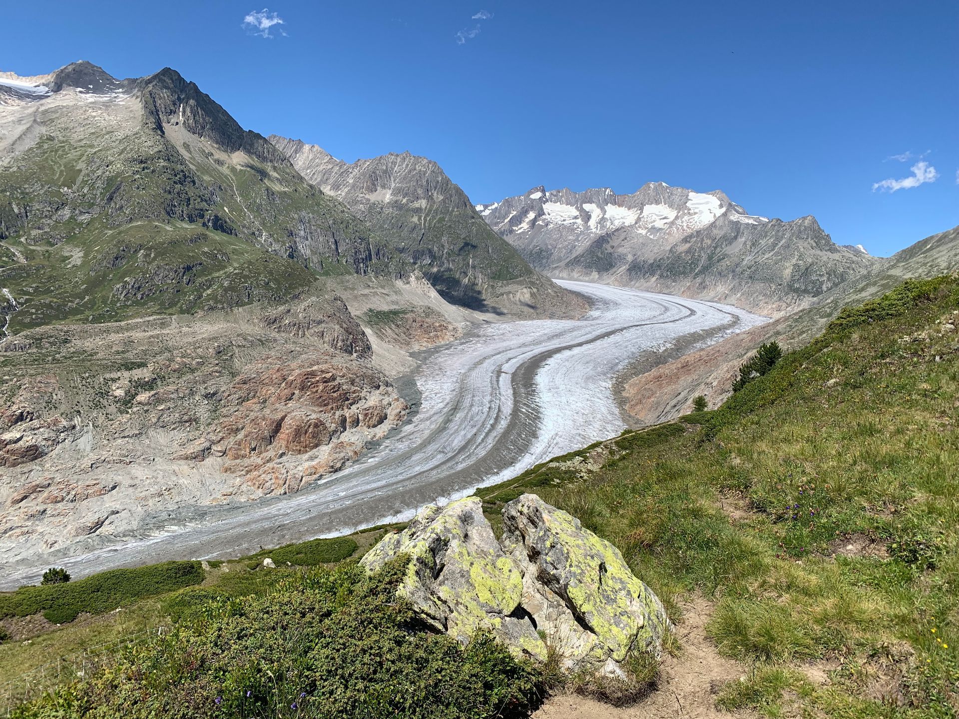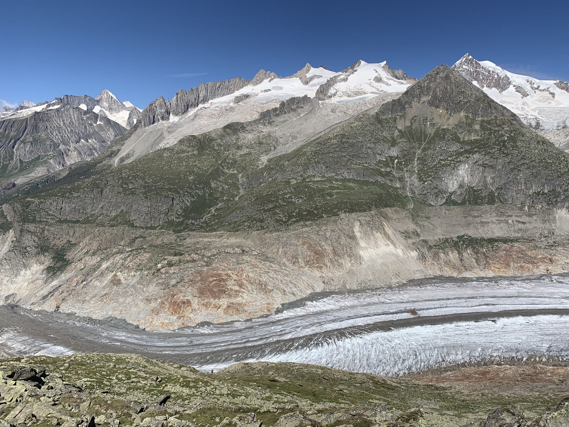 Am nächsten Tag ging es von der Bettmeralp via Gopplerlücke zur Talstation der Gondelbahn Riederalp-Moosfluh. Oberhalb des Aletschwaldes wanderte man entlang der ehemaligen Moränen der gewaltigen Gletscher, mit einer atemberaubenden Sicht über den Grossen Aletschgletscher. Ab Biel gab es auch einen Blick auf die andere Seite des Bergkammes. Der Pfad führte durch eine wilde Berglandschaft, mit prächtiger Sicht über die Riederalp und Bettmeralp. Am View Point Bettmerhorn angekommen wurde man mit einem grossartigen Panorama belohnt. Nach dem Picknick und einem Kaffee im Restaurant besuchte man das Gletschermuseum oberhalb der Bergstation. Dann ging es via Schönbiel und einer Abkühlung im Schönboden See zur Bättmerhütte und auf dem Herrenweg zurück zur Bettmeralp.